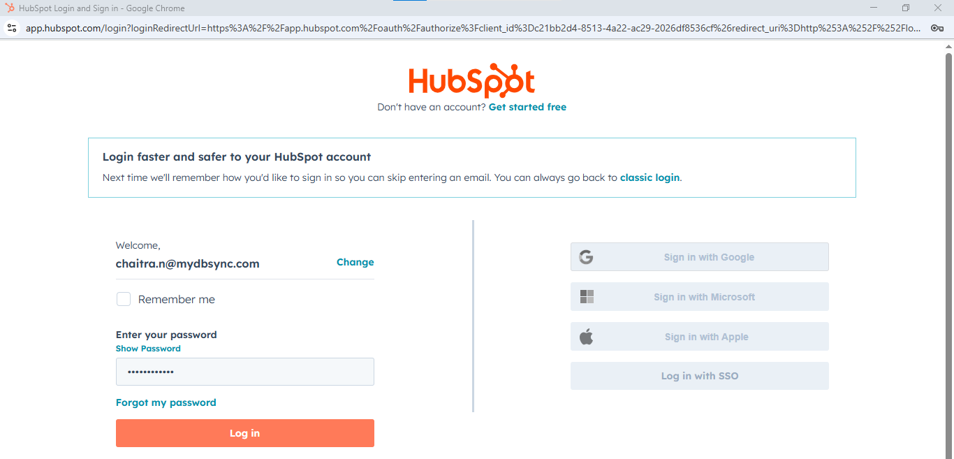 Step 4: Enter your HubSpot username and password, then click Log in.