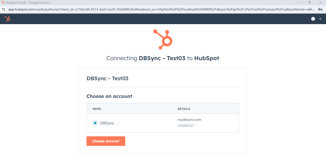 Step 5: Select the HubSpot account you want to connect with DBSync, then click Choose Account.