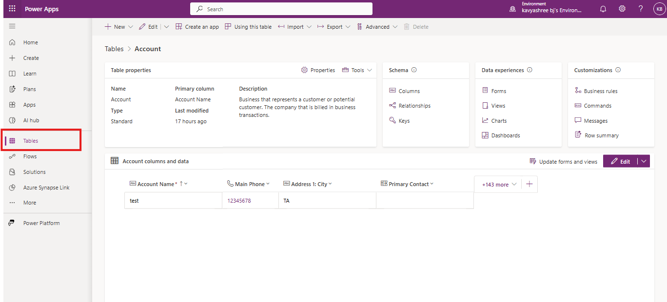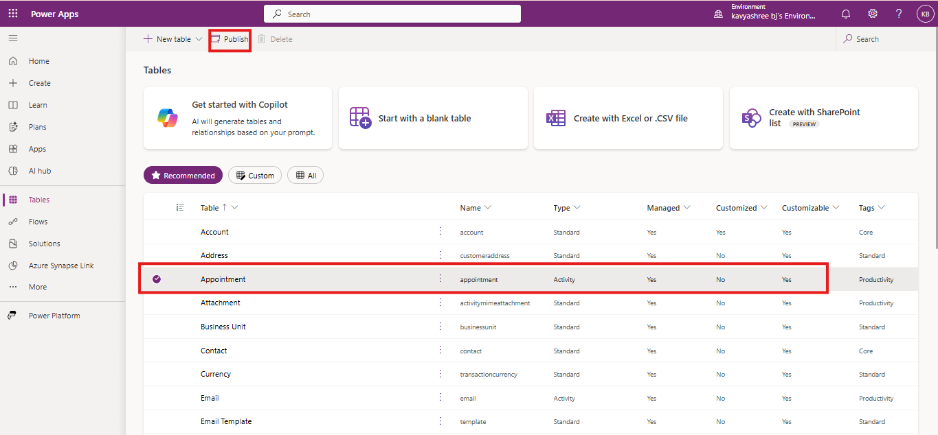 2. In Power Apps, left navigation, click Dataverse → Tables (or Data → Tables) to view tables.\ <br>