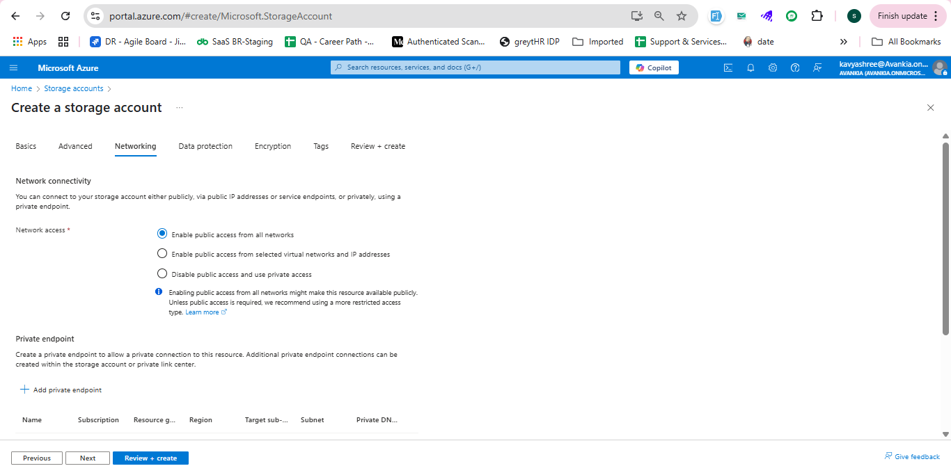 5. (Optional) On Networking, choose connectivity and routing settings appropriate to your security posture (Public access with selected networks, Private endpoints, etc.). You can change this later.
