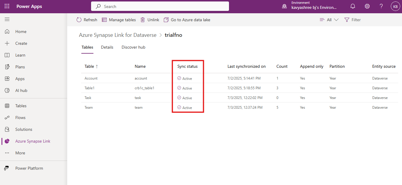 Goal: Confirm that Synapse Link has exported data files (CSV or parquet) and the tables are syncing.