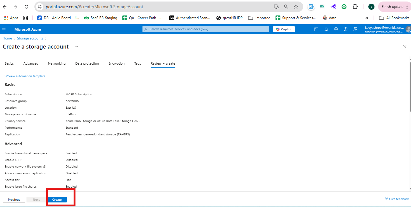 4. On the Advanced tab, enable Hierarchical Namespace (this activates ADLS Gen2 features).