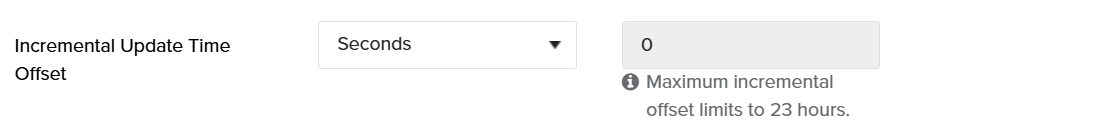 To retrieve the latest data from Salesforce, use this setting. The timeframe specified in this field will serve as an offset to the actual SystemModStamp/LastModifiedDate/CreatedDate timestamp. Select a desired time field from the drop-down option: seconds, minutes, or hours. The latest delta changes are displayed using one of these three time fields. Also specify the number of incremental offset limits. **Note:** The maximum incremental offset limit is 23hours.