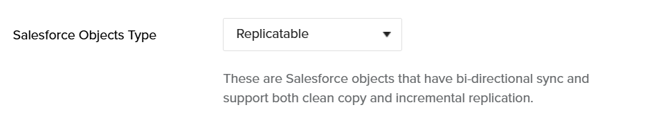 Select the object type as 'Replicatable' or Non-Replicatable'. These are Salesforce objects that have bi-directional sync and support both clean copy and incremental replication