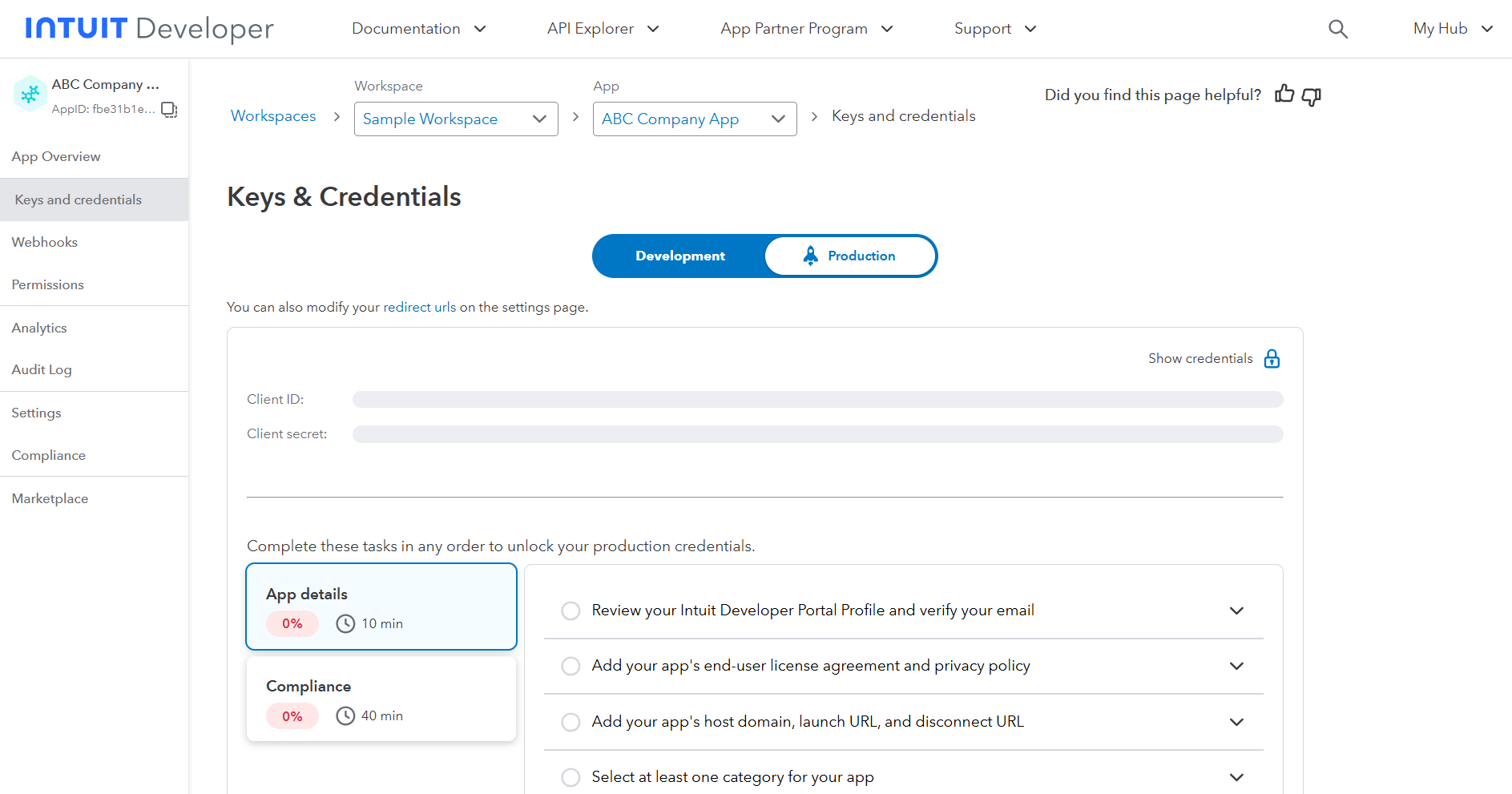 Toggle **Production** on. You will see a message: *“Complete these tasks in order to unlock your production credentials.”*