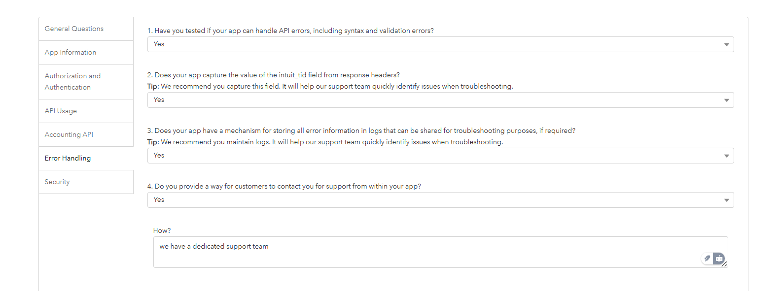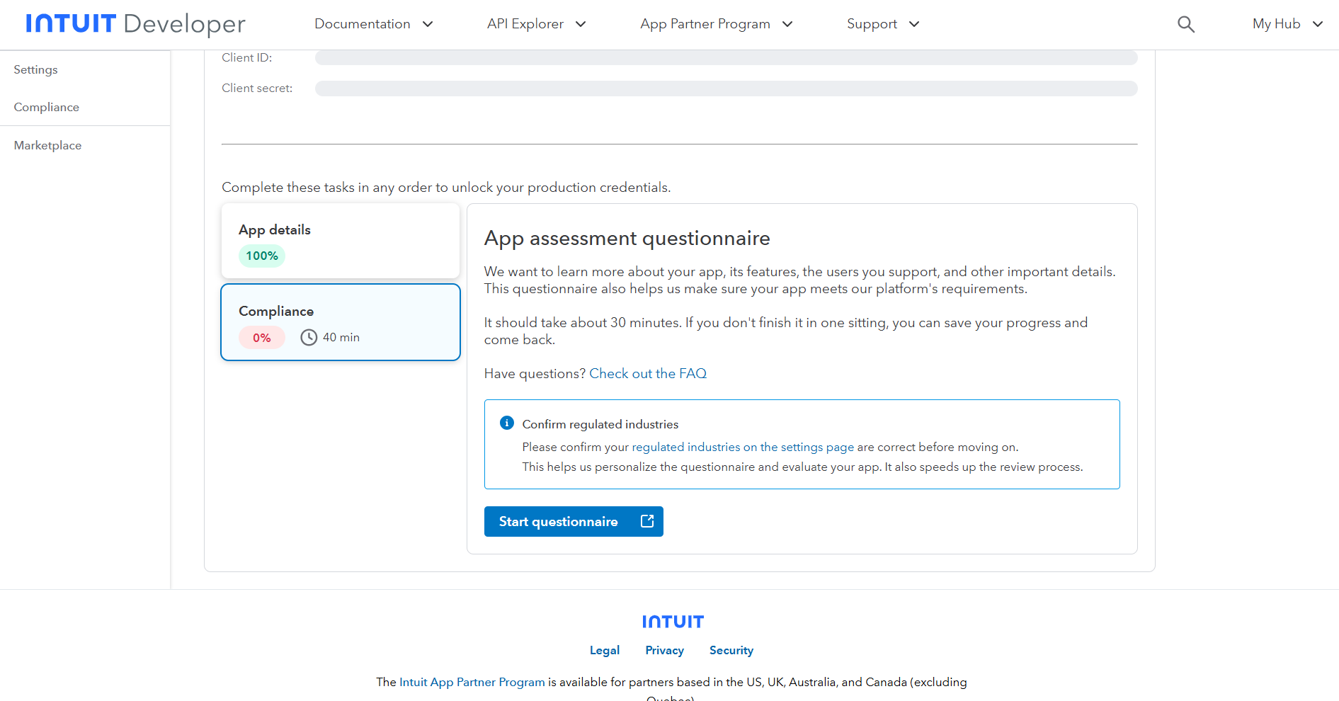 Fill in the required questionnaire that appears to receive your **Client ID** and **Client Secret**. The different sections of the questionnaire, along with the recommended responses, are shown in the screenshot below: