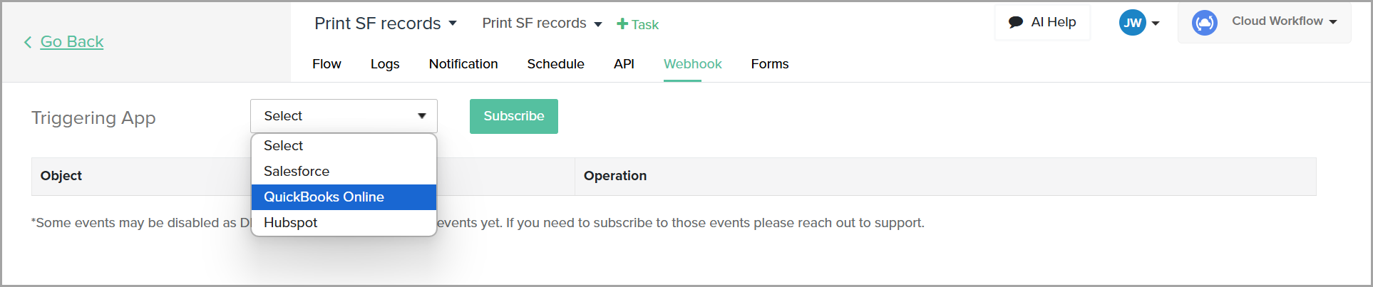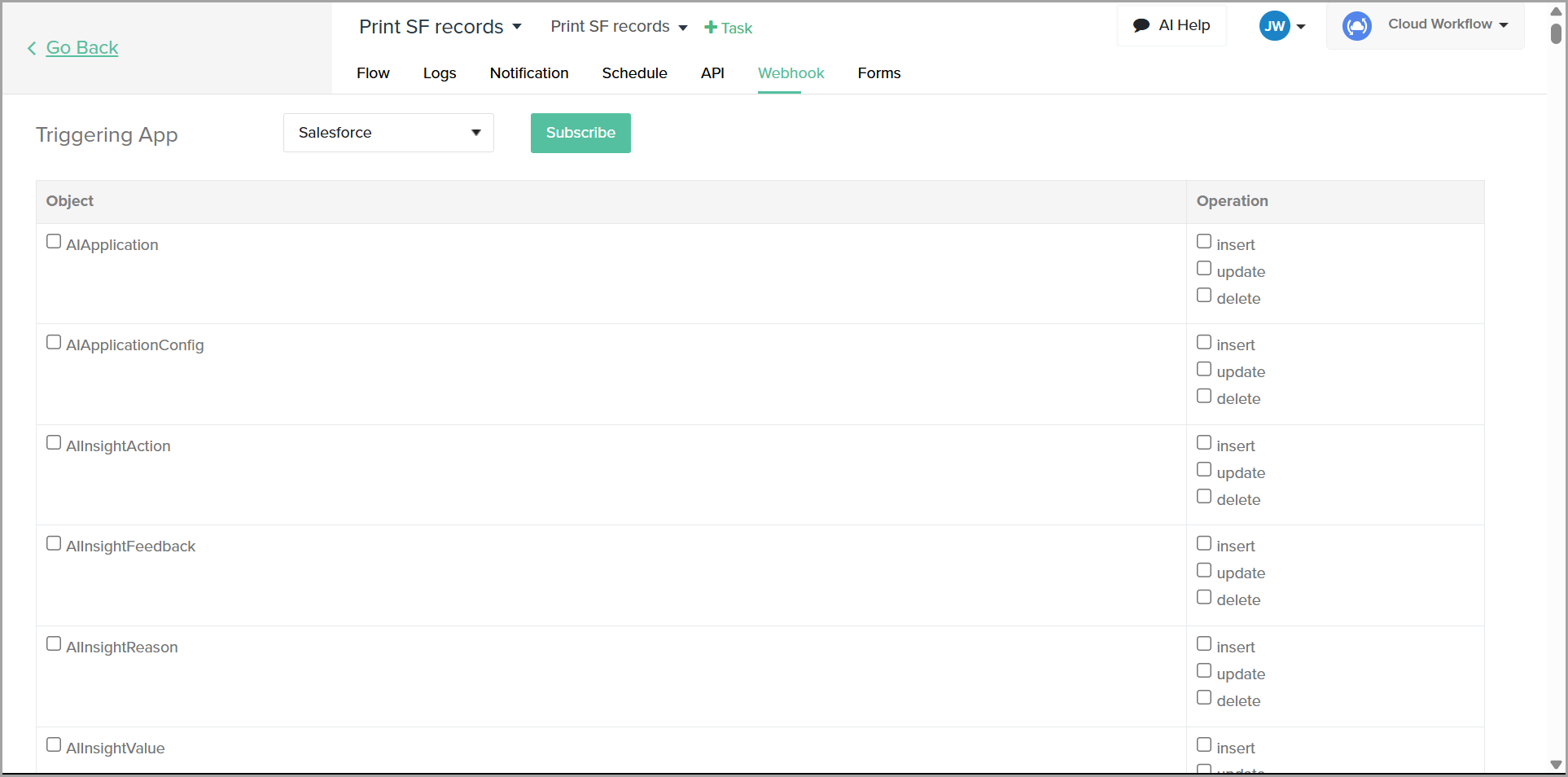 The **Webhook** tab provides functionality for configuring automatic triggers based on events in external applications like Salesforce and QuickBooks Online. By subscribing to specific objects and operations, you can set up webhooks that allow your workflows to be triggered in real-time whenever the chosen events occur, helping you automate and streamline processes more effectively.