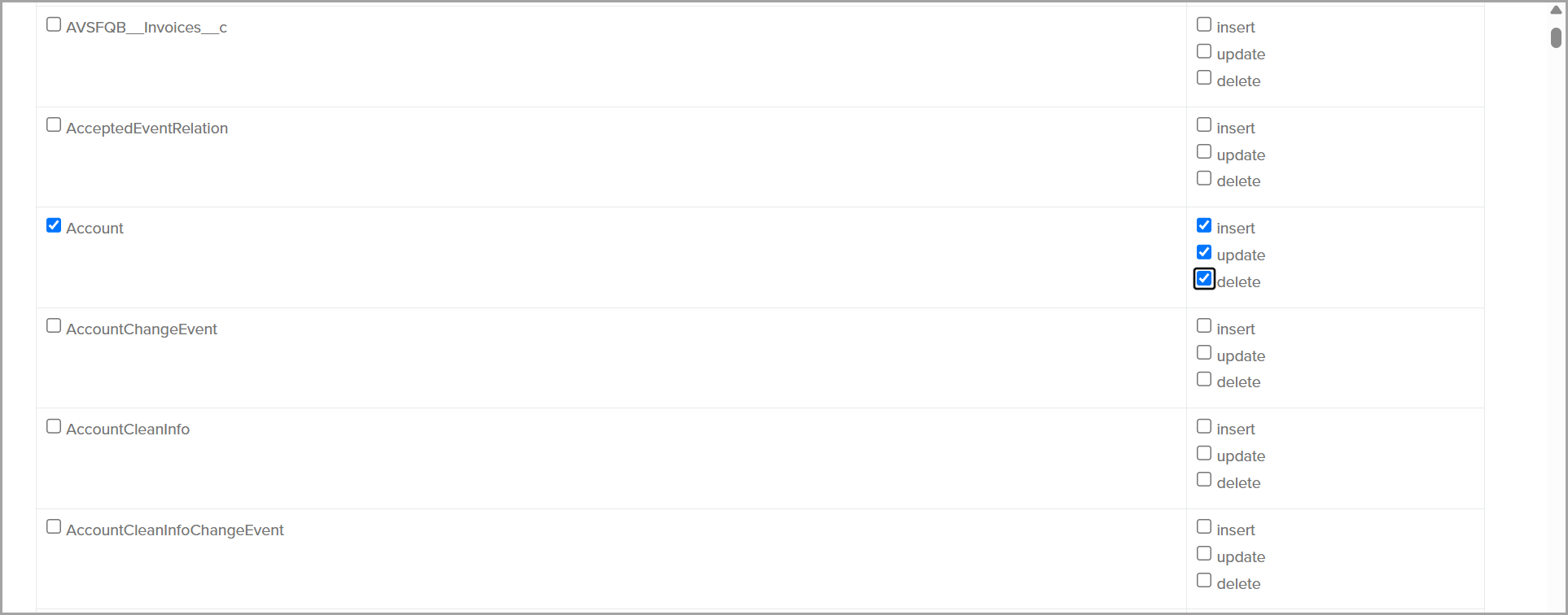 * **Functionality:** You can choose multiple operations (insert, update, delete) for each object. For instance, in the **Account** object example, the webhook is set to trigger on **insert**, **update**, and **delete** operations.