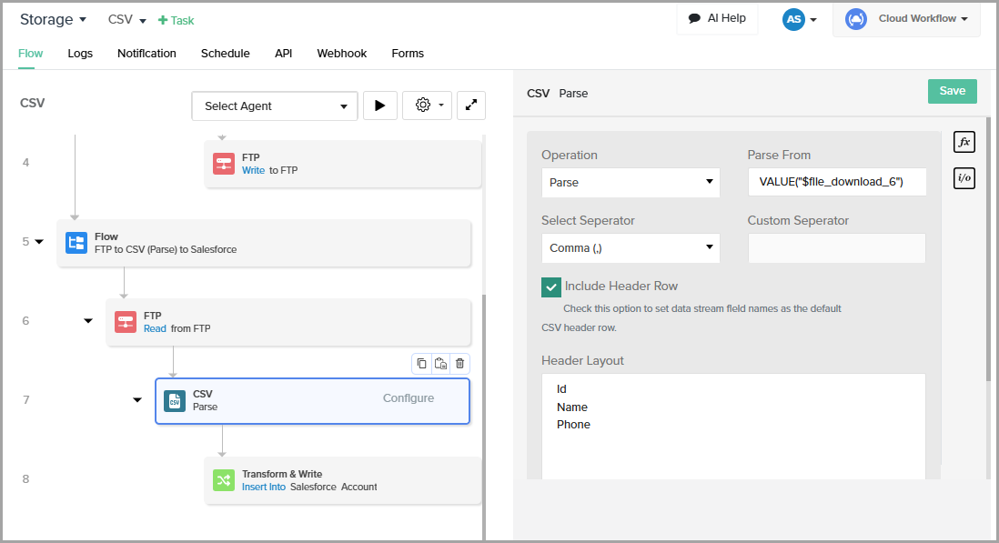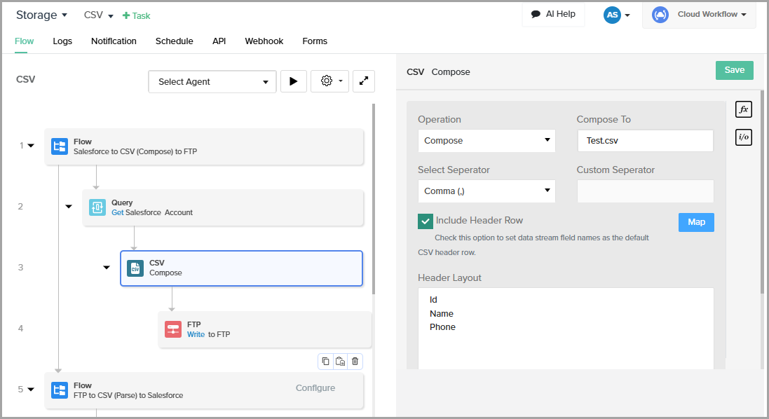 In this article, you will learn how to use the **CSV Storage Action** in **DBSync Cloud Workflow** to create and parse **CSV (Comma-Separated Values)** files during workflow execution.