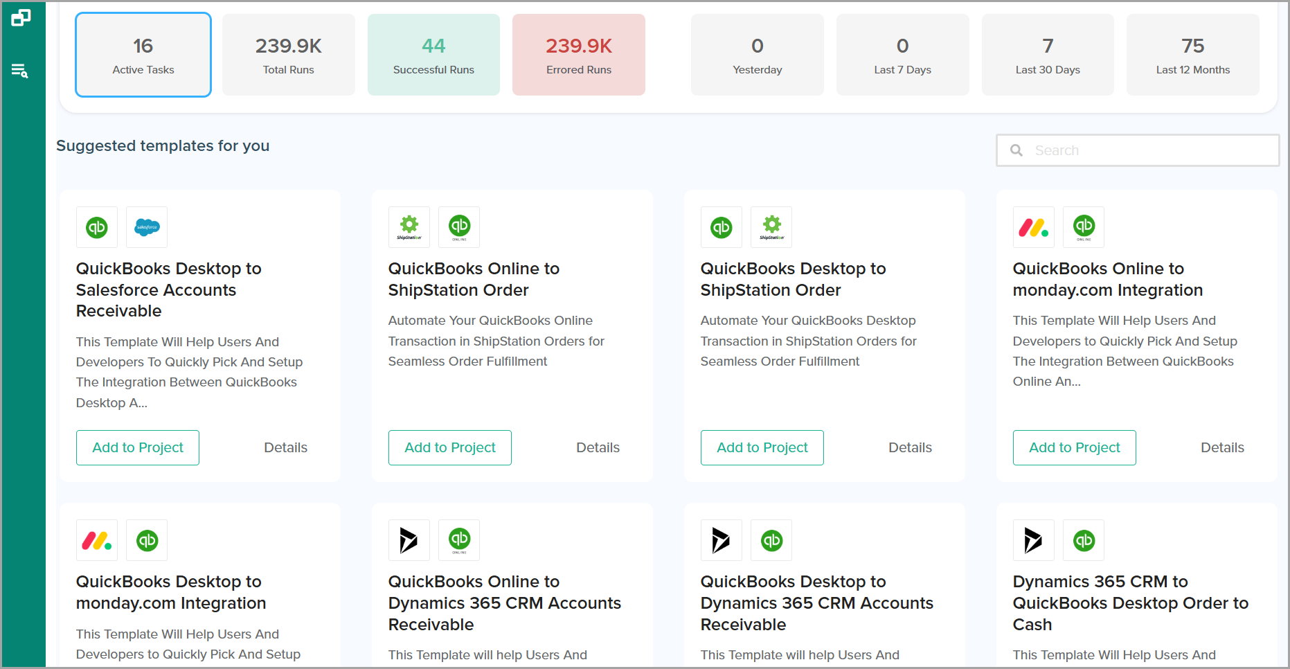 * **Active Tasks:** Displays the number of integration tasks that are currently enabled and scheduled to run. This metric reflects the volume of ongoing automation actively contributing to your business operations.