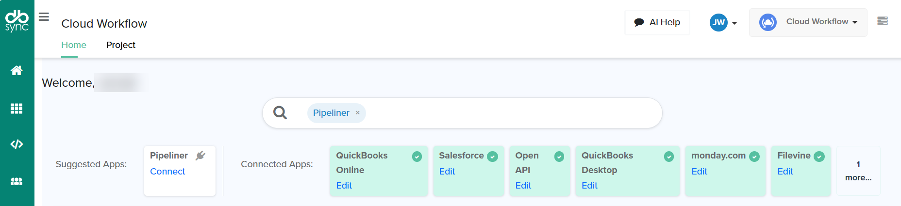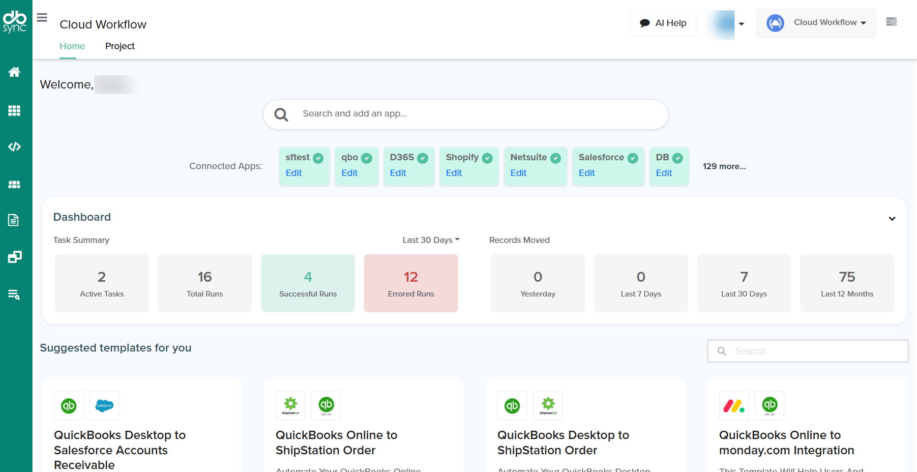 The enhanced dashboard in DBSync Cloud Workflow reimagines the entire first time user journey and ongoing daily operations. It combines a guided onboarding flow with a consolidated landing page that brings critical metrics, helpful shortcuts, and assistance in connecting the applications into a single view.  By reducing clicks and surfacing real‑time insights, the new experience is designed to boost adoption and empower both technical and business users to manage integrations more confidently.