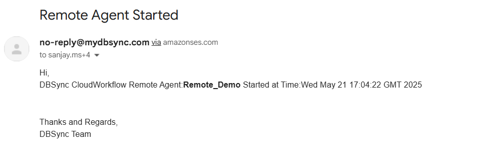 * Body: DBSync CloudWorkflow Remote Agent: \<name> Started at Time: \<time in UTC> UTC