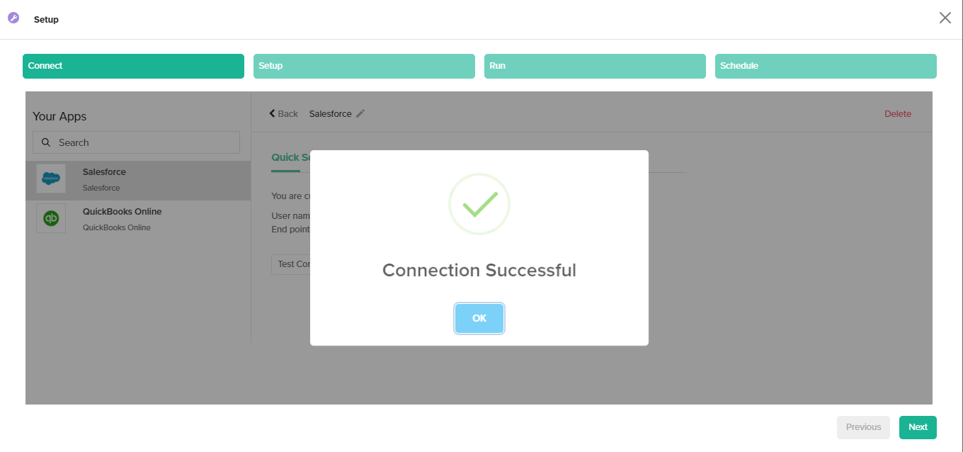 7. After connecting your connectors, click **Test Connection** and you will get a pop-up confirming the same. Ensure you verify the connection for both Salesforce and QuickBooks Online.