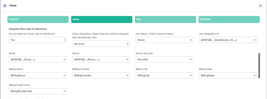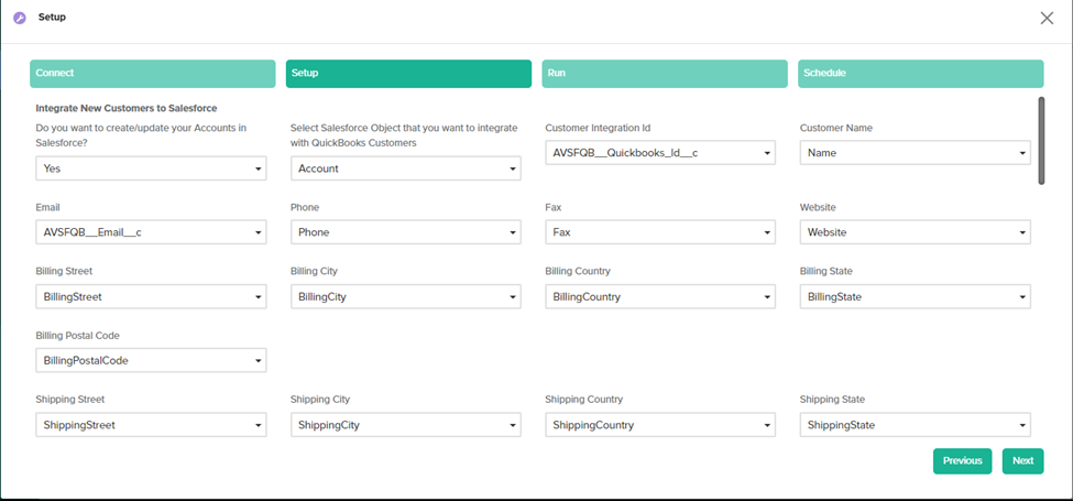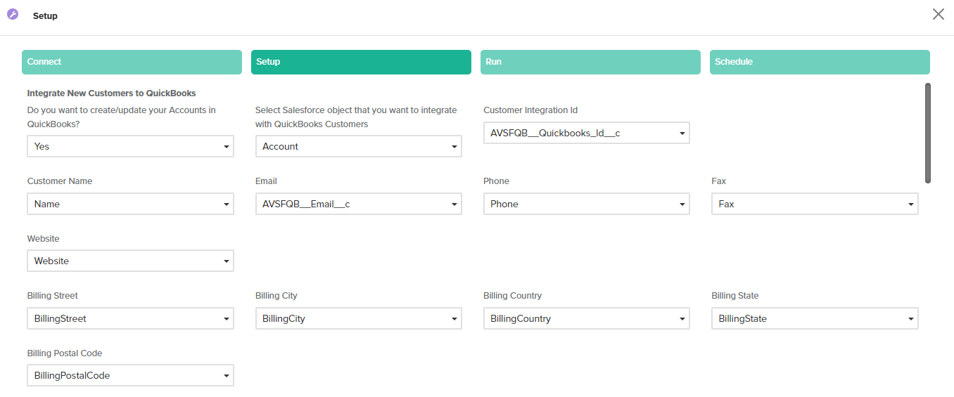Use this form to update all customer records from QuickBooks Online and push them into Salesforce as Accounts. The form is pre-populated with answers for the tabs and you can modify them based on need. The form has the following fields already pre-populated with mapping: