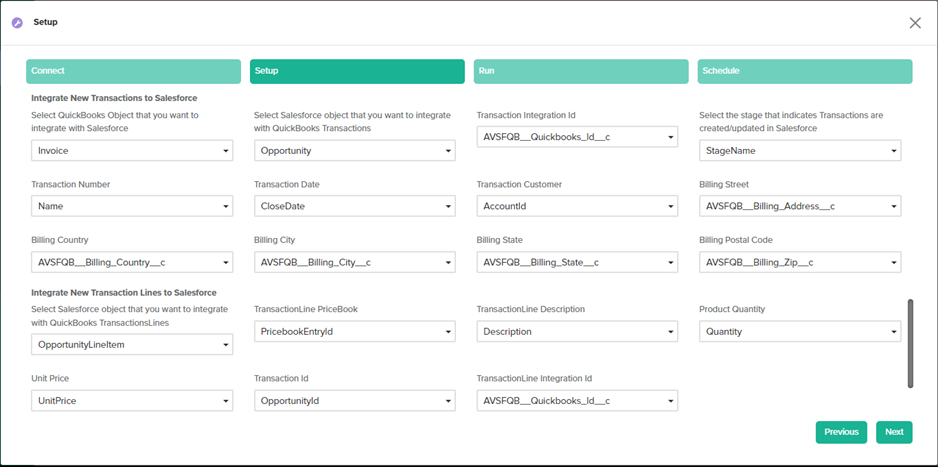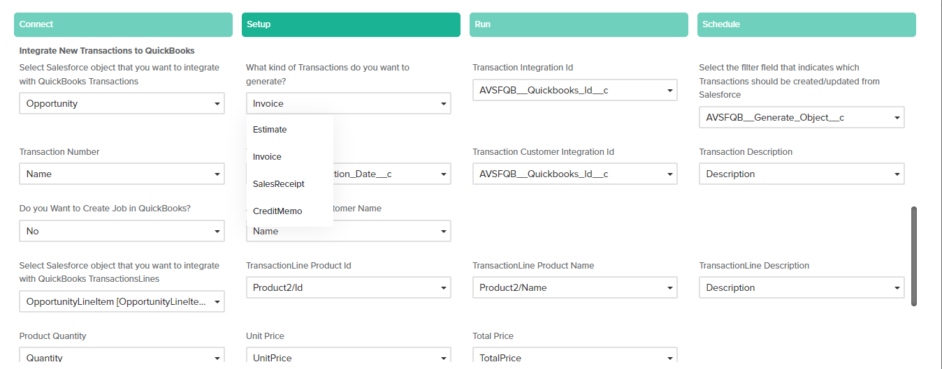 * Select Salesforce object that you want to integrate with QuickBooks TransactionsLines.