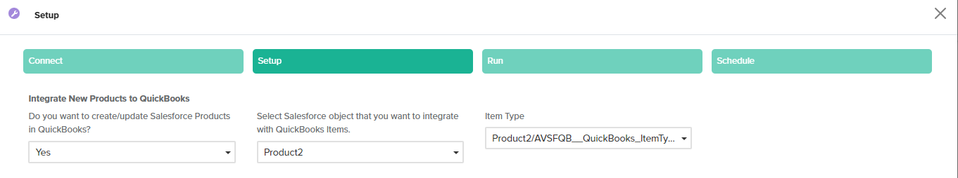 Select the Salesforce object as 'Product' to add product information from Salesforce to QuickBooks Online.